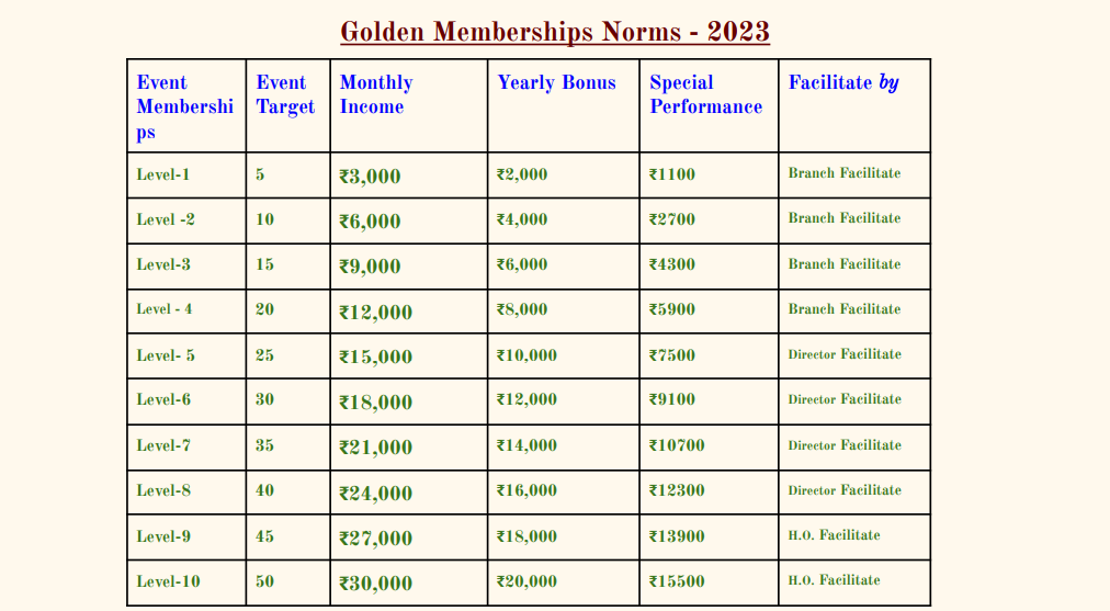 MANAGEMENT PRIVATE LIMITED द्वारा जुड़ने पर एजेंट या वर्कर को एक निश्चित लक्ष्य प्राप्त करने के बाद कम्पनी का मेंबर बनाते हुए मासिक आय अगले एक वर्ष तक दी जाती है।माना XYZ 01/04/2022 से 31/03/2023 तक 50 इवेंट का लक्ष्य पूरा करता है, तो वह लेवल 10 उत्तीर्ण माना जायगा। अब लेवल 10 के अतंर्गत ₹30,000/मासिक एक वर्ष तक दिए जाएंगे इसके साथ ही ₹20,000 बोनस और कम्पनी द्वारा दिए गए एक निश्चित समय मे लक्ष्य को प्राप्त करने पर XYZ को ₹15500 Special Performance allowns भी दिया जाएगा। इसके साथ ही H.O of GOLDEN LATA EVENTS & MANAGEMENT PRIVATE LIMITED की तरफ से सम्मानित उपहार भी दिया जाएगा। लेवल 1 से लेवल 10 तक की